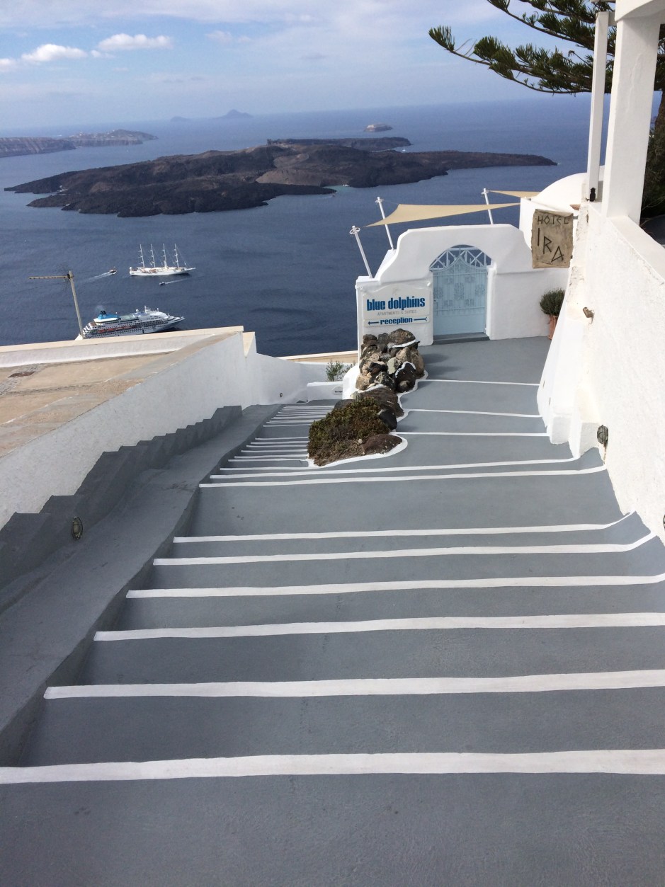 breathtaking! Clean white buildings, royal blue domes and doors, and beautiful flowers overlooking a perfect view of the caldera and Aegean Sea. Side note – being that everything is white, you better have good sunglasses otherwise you won’t see anything since the sun reflects off them all pretty harshly. Most people go to Oia for sunset, however, in our opinion (which we adopted from the locals), the sunset is just as gorgeous from Fira, and I’m sure many other places in Santorini. Oia DOES get extremely crowded however. It’s often the first stop that tourists coming off the cruises make a beeline for….sometimes there can be 3-5 cruise liners anchored a day, which means up to 80,000 visitors a day, making the Santorini port one of the busiest in the world. We aren’t much for crowds, and Oia turned out to be super expensive, so we opted to do a morning trip and spent a few hours walking around, taking in the sights, and snapping photos before we moved on to Amoudi Bay. Be sure to check out the Castle of Oia,